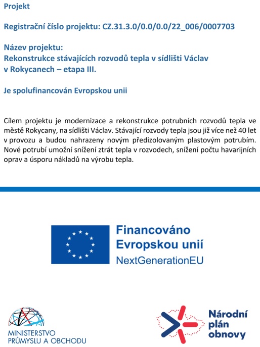 Ve čtvrtek 29.5. předáme staveniště generálnímu dodavateli, firmě SUPTel, a rekonstrukce zbývající části tepelných rozvodů v sídlišti Václav v Rokycanech bude moci začít. Tentokrát jsme zvolili technologii předizolovaných plastových rozvodů, které jsou výrazně méně náročné na montáž i pokládku a zásahy do okolí i provozu sídliště by tak měly být minimální. Cílem rekonstrukce je nejen obnova zastaralých rozvodů, ale především snížení tepelných ztrát a úspora nákladů na energie pro naše zákazníky.